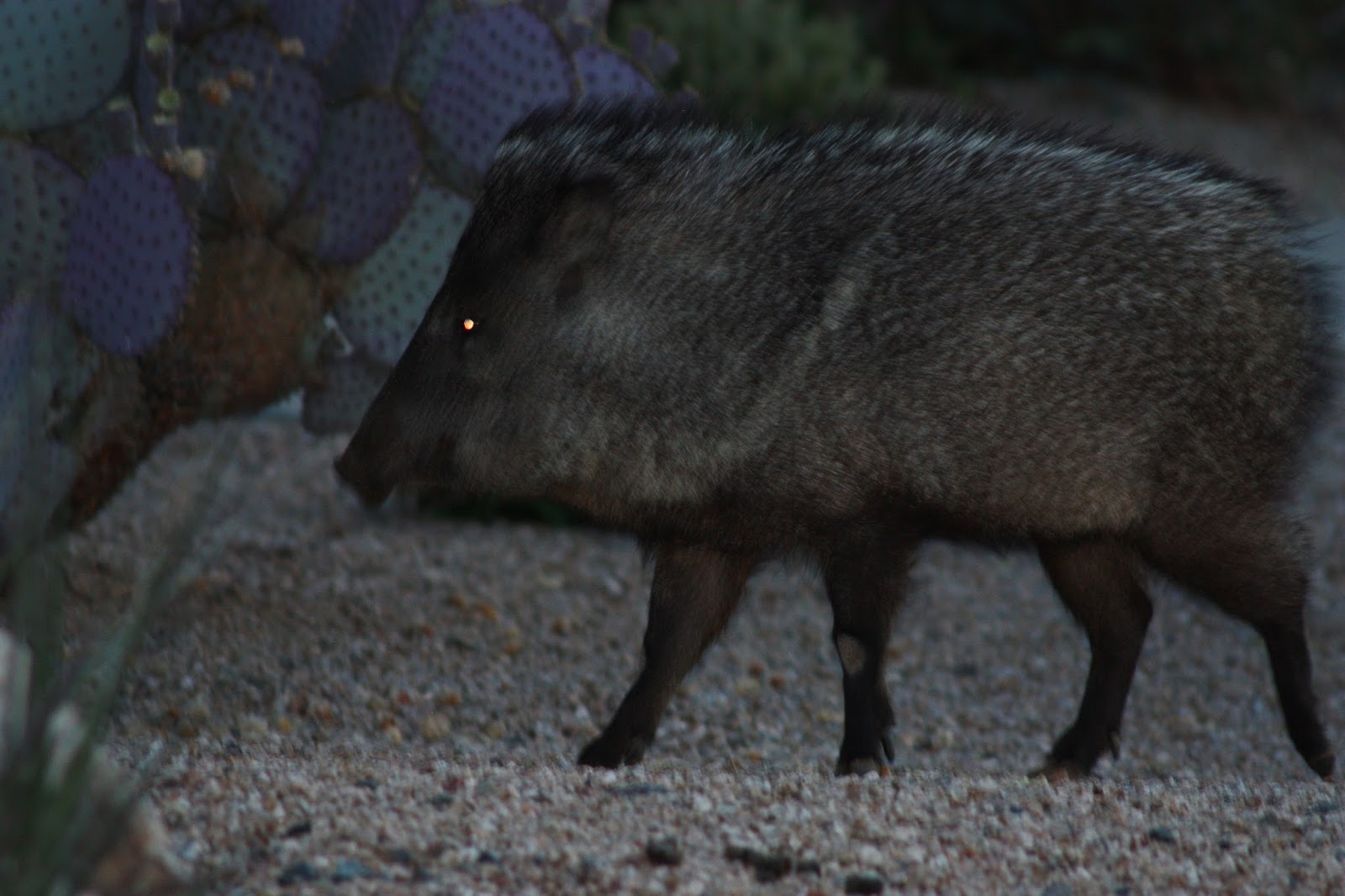 One notable crepuscular desert dweller is the Javelina, or Collard Peccary. I have only seen them during twilight hours. Unless sick, javelinas will travel in bands of 6 – 12 animals led by a dominant male. They have many incredible design features, such as their ability to eat prickly pear, spines and all. Javelinas derive most of their water from the plants they eat, so juicy prickly pear are among their favorite. Watch for prickly pear plants that look like they have been torn versus cut or barrel cacti that have been overturned with the flesh scooped about like a tunnel into the underside.