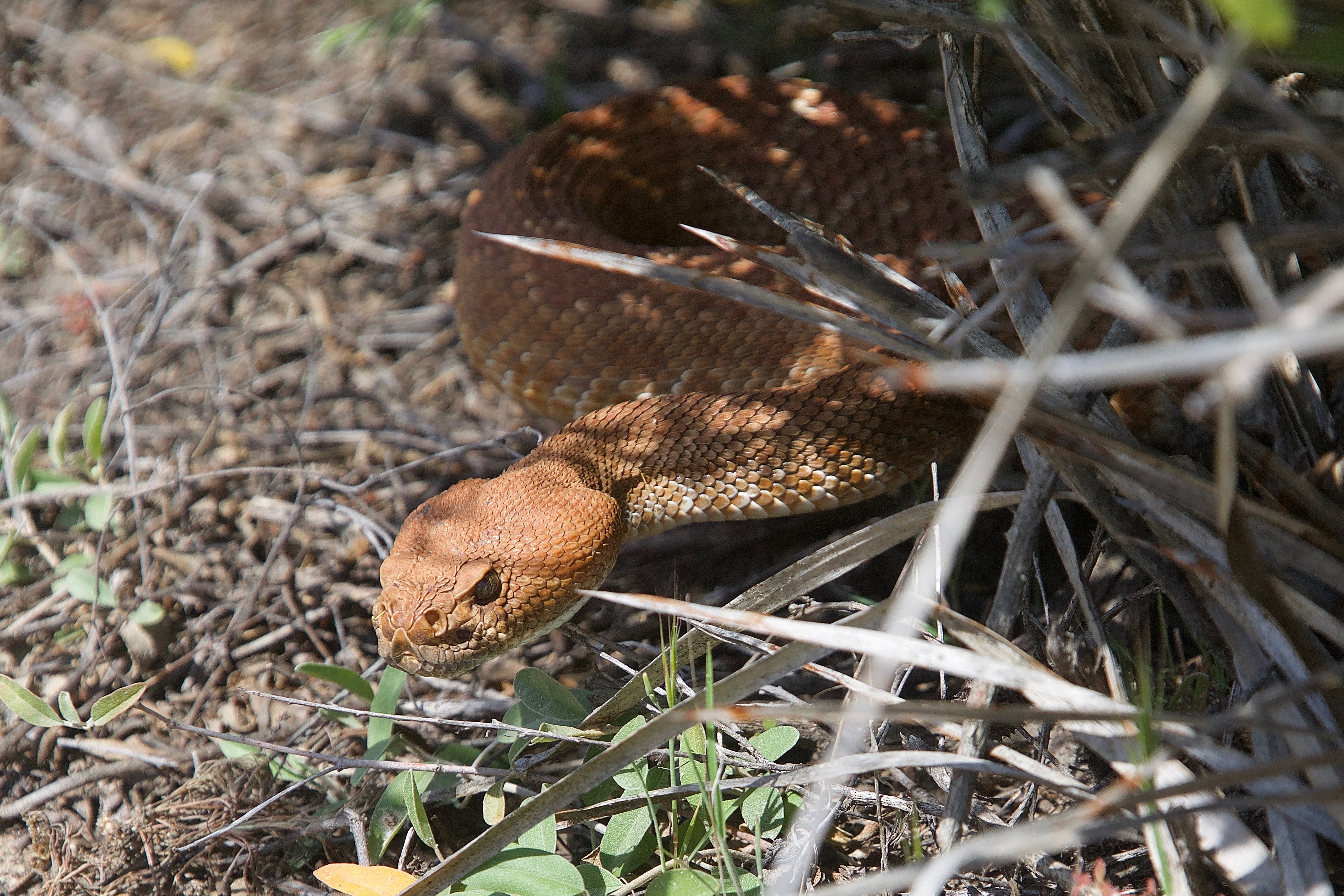 Rattlesnakes winter in sheltered dens often in areas where large rocks provide protection. Snakes can’t burrow for themselves, so rely on naturally occurring holes and crevices or burrows and tunnels made by other animals to find shelter and survive the cold months. To share body heat, snakes will actually gather in dens and if it is really cold in an area with sparse winter food, many snakes will pile together in what is called a “ball.” As the ground warms in spring, they come out to warm up.