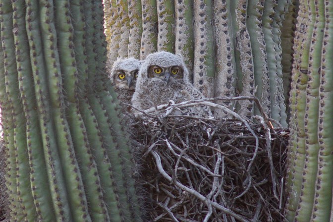 Starting in the fall, great horned owl activity picks up and their signature hoot can be heard in the night as they prepare for mating and owlet rearing. They are establishing territory and re-connecting with their mate, as most great horns mate for life. They are lazy homemakers and will set up their nursery in the abandoned nest of another bird or mammal, often up high on rocky ledges overlooking open areas for hunting. In the deserts, the mighty saguaro cactus fits the bill.