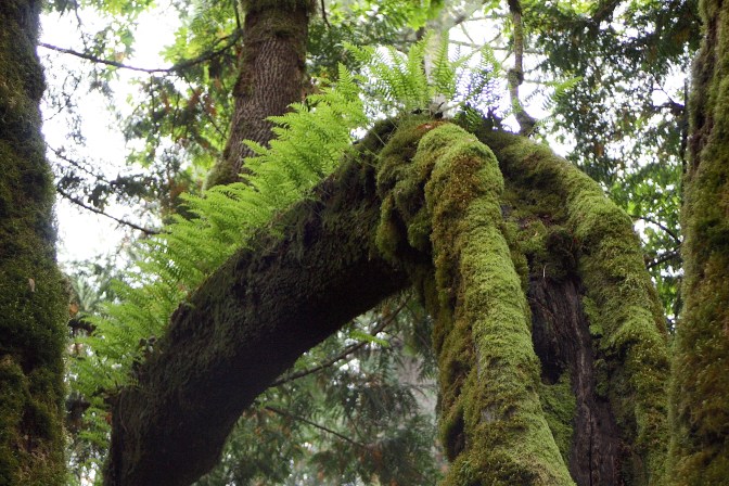 Mosses are a member of the plant kingdom, but confusion sets in when we learn that they are flowerless, seedless and have no true leaves, stems or roots. They have leaf-like, stem-like and root-like structures and reproduce by lifting spores above their heads to be carried away on the wind. Unlike the towering trees on which they grow, mosses are completely dependent on the micro movement of wind and water to get anything done. Their primitive structures teeter precariously between supple expansion and shrinking compression with every rain cycle.